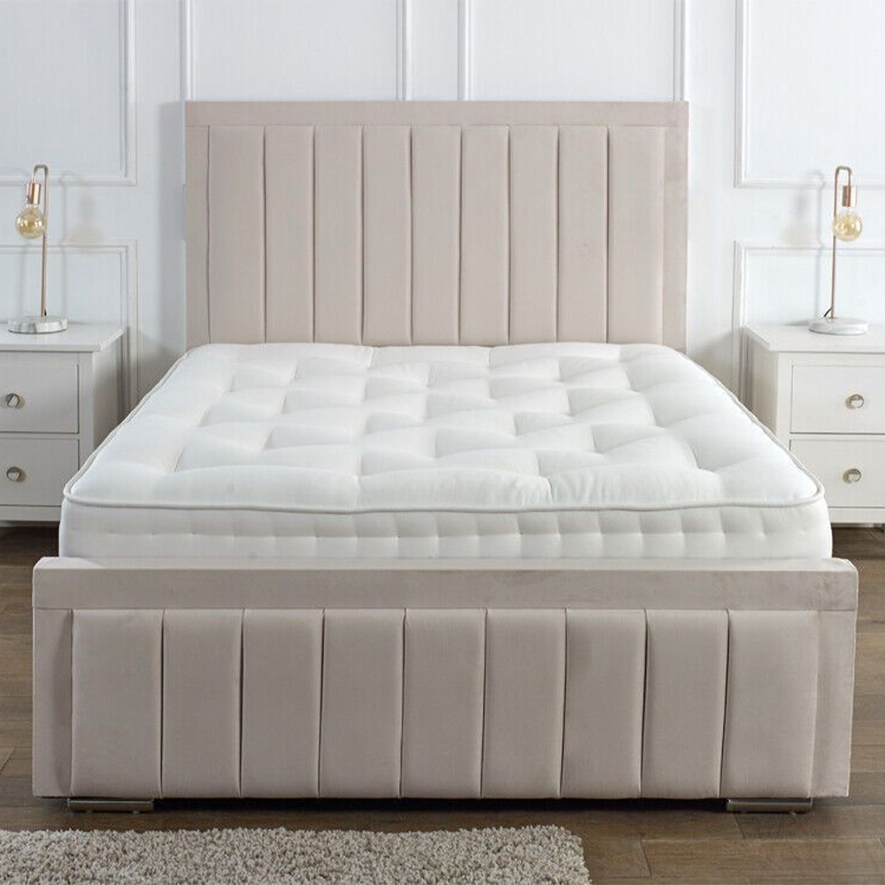 Bring timeless elegance into your bedroom with the Windsor Bed. Upholstered in a soft, neutral fabric, this bed combines modern style with classic detailing. The vertically stitched headboard and matching footboard create a clean, tailored look, while the padded panels add a touch of luxury and comfort.